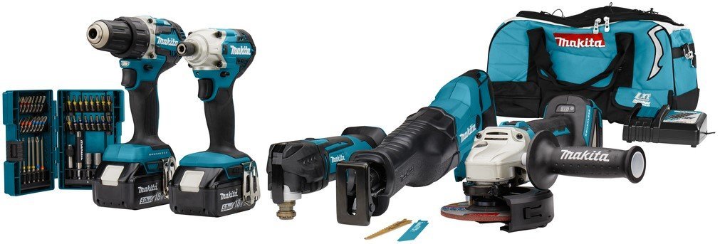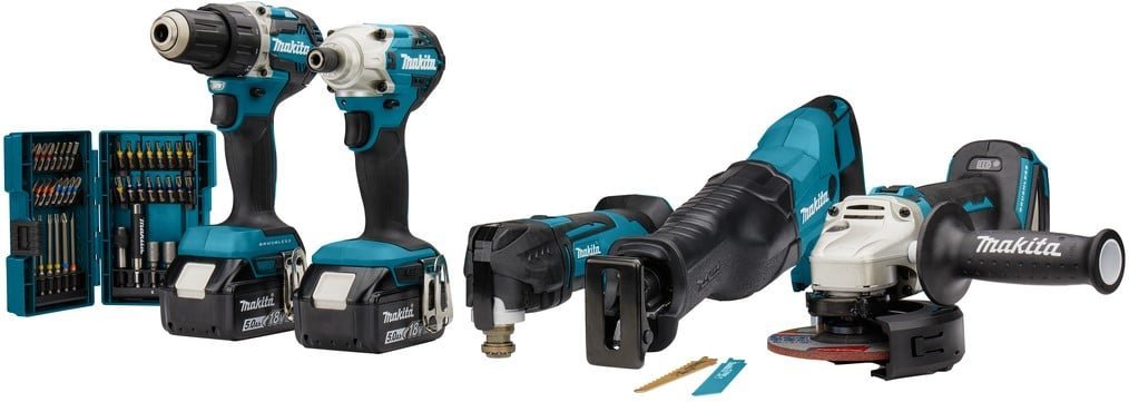 Deze combiset met de onderstaande 5 machines wordt geleverd met 2x BL1850B accu, een snellader en een bitset. De set wordt geleverd met de bekende tas voor de combisets en zit verpakt in een doos.